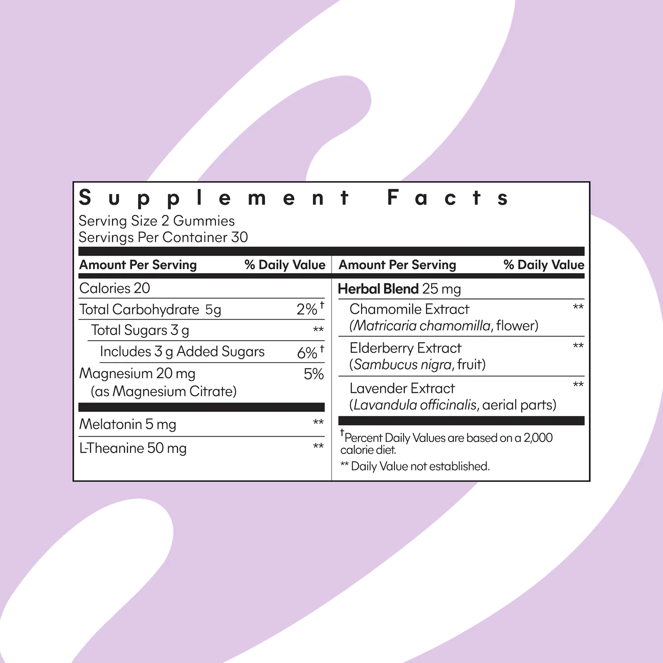 Fall asleep blissfully and wake up beautifully with our expert formulated gummies to promote healthy sleep patterns. Formulated with Magnesium, Melatonin, L-Theanine and dreamy botanicals.*